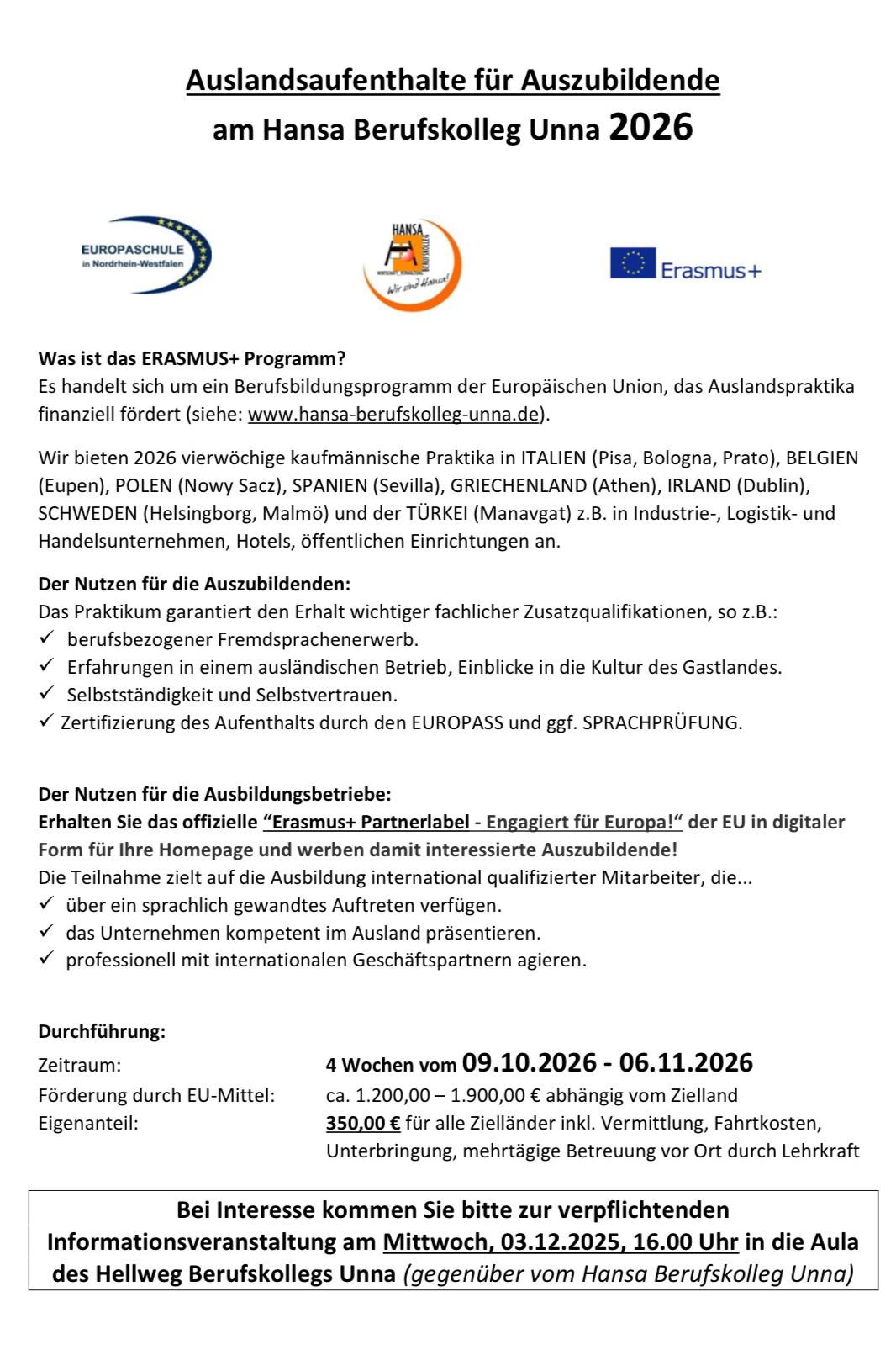Herzliche Einladung zur Teilnahme an unserer ERASMUS+ Veranstaltung am 03.12.2025 um 16.00 Uhr! Bewerben Sie sich jetzt für Ihr ERASMUS+ Auslandspraktikum 2026 – hier können Sie direkt mit den ehemaligen Teilnehmern sprechen, die ihre vierwöchigen Auslandspraktika in acht europäischen Ländern durchgeführt haben und gerade zurückgekehrt sind. Zusätzlich haben Sie die Chance, sich unverbindlich in eine Interessentenliste einzutragen. Es gibt in jedem Jahr deutlich mehr Bewerber als Plätze, die den Sprung ins Ausland wagen und mit tollen Erfahrungen wiederkommen. Wir freuen uns auf Sie!